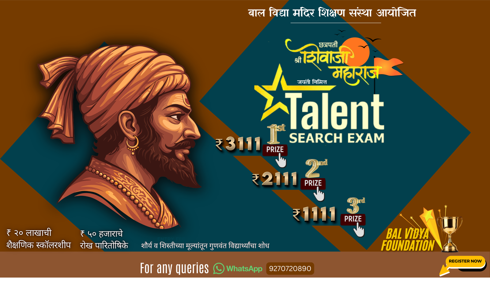 TALENT SEARCH EXAM – REGISTRATION FORM Student Full Name Class Class4th5th6th7th8th9th Enter School Name Division Division A (अ)B (ब)C (क)D (ड)E (ई)F (फ)G (ग)Other Last Year Percentage (%) Select Exam Location Select Exam LocationBal Vidya Vihar, Ambikanagar, ParbhaniBal Vidya Mandir Highschool, Vaibhav Nagar, Vasmat Road, Parbhani Guardian’s Full Name (Parent / Legal Guardian) (As per official records) Guardian’s Occupation (Select One) Guardian’s Occupation (Select One)Government EmployeePrivate EmployeeFarmerWorker / LabourSelf-Employed / BusinessOther Parent WhatsApp Number – (Parent / Guardian) Alternate Contact Number Important Declaration (I Agree) Important Declaration (I Agree) I confirm that the above information is true and correct. I will follow all exam rules and instructions. Register Now